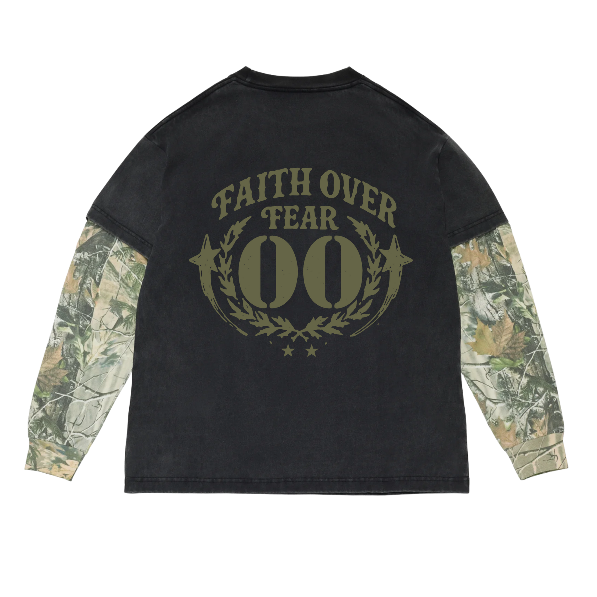 The Faith Over Fear Longsleeve blends handcrafted character with a bold, faith-driven identity. Built from premium heavyweight cotton and finished with a true vintage wash, it delivers a soft, lived-in feel from the very first wear. The washed charcoal body is paired with full camo-print long sleeves, creating a layered 2-fer look with depth and visual contrast.